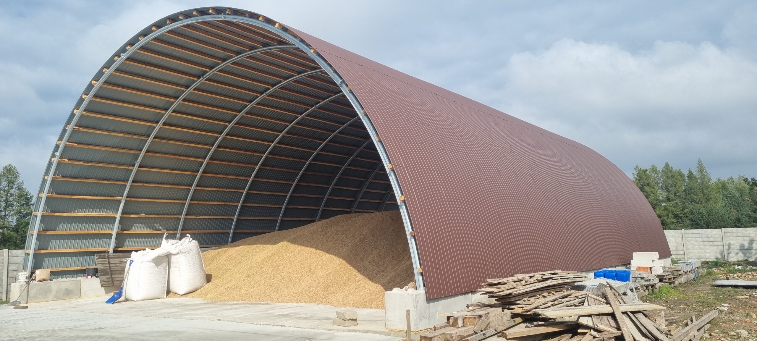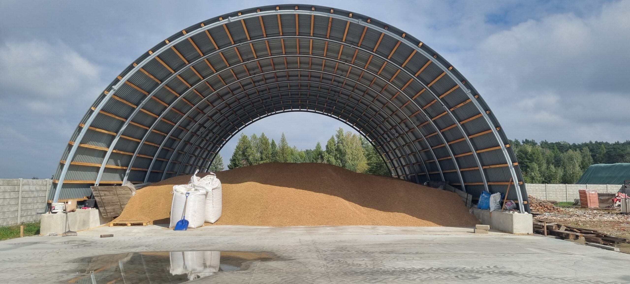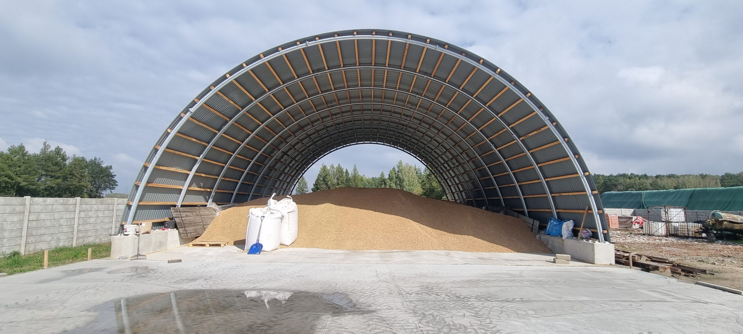 Szerokość hali: 14.3 m mierzone w osi konstrukcji, po zewnątrz 14.5m.